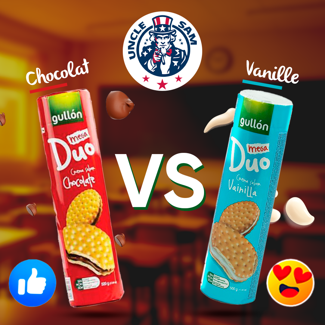 Campagne visuelle ludique comparant deux saveurs de biscuits Gullón. L’approche “battle” crée de l’interaction et attire l’attention des consommateurs.